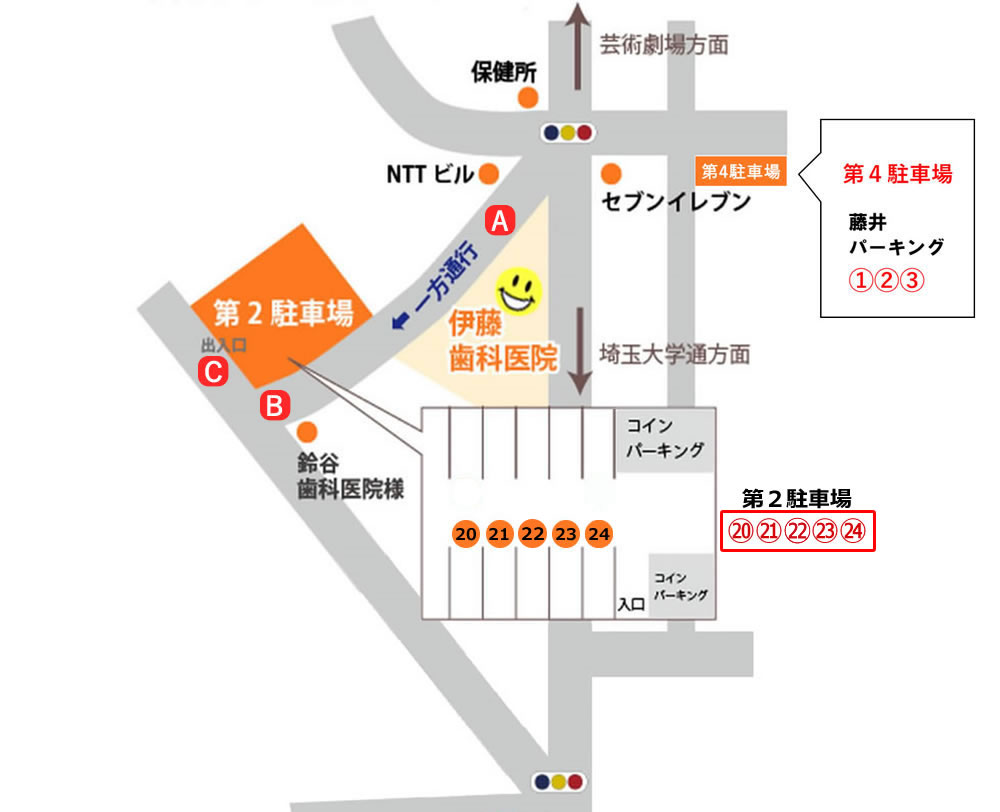 上記地図A:第2駐車場へつながる医院前の一方通行の道路です。