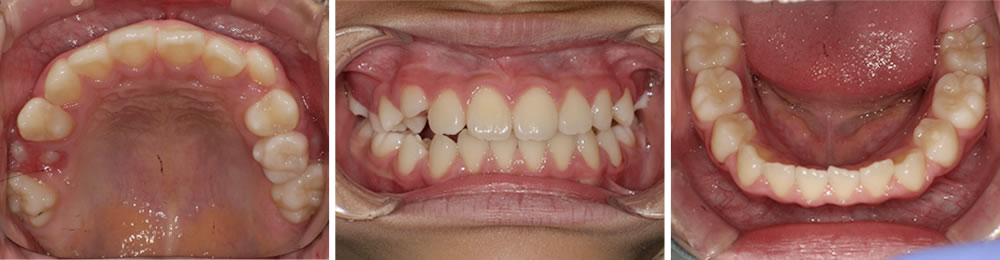 矯正を始める前の口腔内の状態です。下の前歯が生え変わる際にスペースが不足しているため、歯が斜めに生えてきていることが分かります。